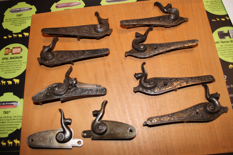 Sammlung: 8 Stück Hahnseitenschlösser für Flinten, 1 Stück für Zimmerstutzen