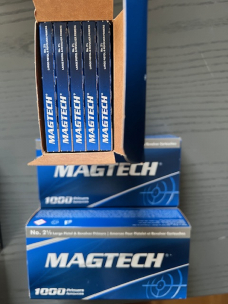 Zum Verkauf stehen 3.500 Magtech Zündhütchen. No. 2 ½ Large Pistol & Revolver Primers. Sauber und trocken gelagert. Ab 1,--€ ohne Versandkosten in D. Versicherter Versand. *****Bitte beachtet auch meine anderen Auktionen. *****