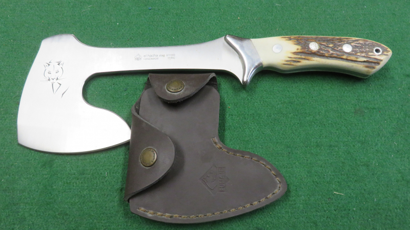 1 Puma IP Campingbeil (Jagdhüttenbeil) " el Hacha stag " mit der originalen Sattellederscheide, sehr schönem Hirschhorngriff, der Zustand ist neu und unbenutzt.