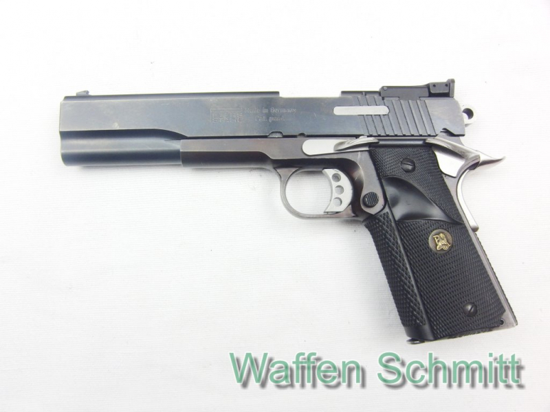 Sie bieten auf eine Sport-Pistole Peters Stahl PSP07 im Kaliber 9mm Luger. 6“ Lauflänge mit verstellbarer Visierung (Lauf von innen ohne Mängel), Colt 1911er Nachbau mit außenliegendem Hahn, Abzug mit Triggerstop, einseitige Schiebesicherung und Handballensicherung, seitlicher Magazinhalteknopf, 8-Schuß Magazin, schwarze Pachmayr-Gummigriffschalen für Rechts-und Linksschützen. Guter Zustand!!!