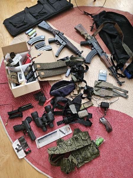 Ich biete hier ein umfangreiches Softair-Komplettset an, bestehend aus 3 Softair-Waffen samt diversem Zubehör. Ideal für Einsteiger, Sammler oder Gelegenheitsspieler, die direkt komplett ausgerüstet sein möchten. Alles stammt aus irgendwelchen Paketen, die ich mal gekauft habe, wo ich aber keine Verwendung für hatte. Die beiden Gewehre sind Akkubetrieben und hatten beim letzten Testen (vor ca. 6 Monaten) funktioniert, also normal eine BB verschossen. Gemäß eingravierten Schriftzügen ist die MP5 von Classic Army und die AK47 von Tokio Marui. Gerade die AK47 hat deutliche Gebrauchsspuren und es fehlt hinten die Schaftkappe. Das restliche Zubehör ist ungeprüft, daher wird alles ausdrücklich als Defekt verkauft.