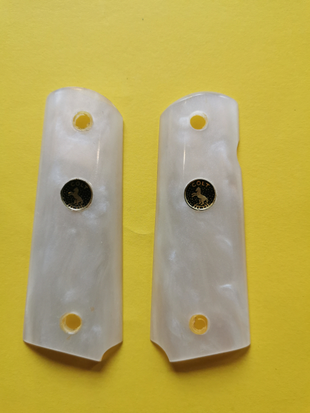 Griffschalen für eine Colt Goverment Modell 1911. Das Material scheint aus Kunststoff zu sein und stellt eine Perlmutt Imitation dar. Sehen an einer 1911 sehr gut aus. Ob diese Griffschalen auch an andere Modell wie Schreckschusswaffen montiert werden können entzieht sich meiner Kenntnis.