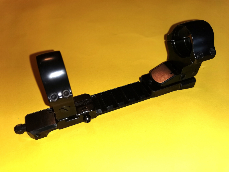 ZF Montage für eine SIG 550 / PE 90 mit Original Diopter. Die Montage wird auf das dafür vorgesehene Dreieck auf der vorderen Gehäuseseite aufgeschoben und wird auf der Hinterseite mit einer konischen Schraube in der Halterung für den Diopter fixiert und befestigt. Das Profil der Montage ist eine Picatinny Ausführung komplett aus Stahl. Auf der Vorder und der Hinterseite wurde die Schiene umgearbeitet um eine EAW Schwenkmontage verbaut. Dieses ermöglicht das montieren und demontieren ohne Werkzeug und Treffpunkt Verlagerungen. Die dazugehörigen Ringe gehören mit zur Montage, der Ring Durchmesser beträgt 25mm die Bauhöhe ist so bemessen das Gläser mit 56mm Objektivdurchmesser verbaut werden können. In der freien Mitte der Schiene könnte zusätzlich noch ein kleines Leuchtpunktvisier montiert werden, wenn kein Glas montiert ist.