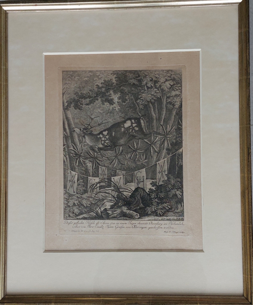 Sie bieten auf einen Kupferstich von M. E. Didinger, der die Jagdszene auf einen gefleckten Rothirsch während einer damals üblichen "Lappenjagd" darstellt. Dieser Hirsch wurde 1715 von Graf von Ohringen erlegt.