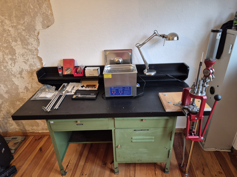 Dazu gibt es einen massiven Wiederladetisch (ca. 100 kg), einen Ultraschallreiniger, digitale Waage, Messschieber und diverses Zubehör.