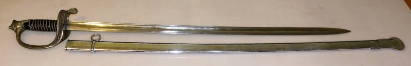 schwerer Säbel, ohne Stempel oder Hersteller, ich denke mal vor 1900 und vielleicht Frankreich, Messingbeschläge, die Scheide hat ein paar kleine Dellen, der Ring ist fest, die Klinge hat 2 Kehlen und ist in einem guten Zustand. Der Griff wackelt leicht. Ein insgesamt sehr schönes Stück.