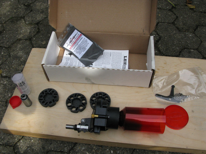 Hier biete ich ein sehr wenig gebrauchtes Lee Auto Disk an. Ich hatte es zu meiner Classic Turret Presse gekauft, bin aber bei meinem Redding Füllgerät geblieben (nehme also die Hülse zum Füllen aus der Presse heraus). Das Füllgerät wird in die kombinierte Aufweit/ Füllmatrize des Lee Matrizensatzes eingesetzt und durch die hochfahrende Hülse aktiviert. Am Ende der Aufwärtsbewegung wird die Hülse aufgeweitet. Mit dabei ist ein zweiter Betätigungshebel und ein Betätigungskettchen (für andere Lee Pressenmodelle?) Es liegen vier Scheiben mit je 6 unterschiedlich großen Pulverkammern bei. Dabei muß erst einmal durch Versuch die richtige Pulverkammer ermittelt und die Scheibe entsprechend eingesetzt werden. (Tip: Die gewünschte Pulvermenge abwiegen und dann mit dem Pfännchen der Pulverwaage in eine passend erscheinende Pulverkammer einfüllen. Bei Nichtpassen andere Pulverkammer probieren. So findet man relativ schnell und mit wenig Ein- und Ausbauarbeit die passende Kammer. Dafür hat man eine sehr gute Wiederholgenauigkeit. Als Anhaltspunkt kann für bestimmte Pulversorten auch die abgebildete Liste dienen)