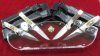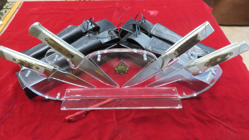 1 Sammlung von 4 Original Puma Messer " Frühling, Sommer, Herbst, und Winter. Alle 4 Messer mit den dazugehörigen Sattellederscheiden in Schwarz mit der Aufschrift " 4 Jahreszeiten" dazu den Messerständer für die 4 Messer und die 4 Pappkartons von Puma. Alles ist neu und ungebraucht. Die Griffe der Messer sind aus ausgesuchtem Hirschhorn gefertigt. Alles in allem ein sehr schönes Sammlerstück.