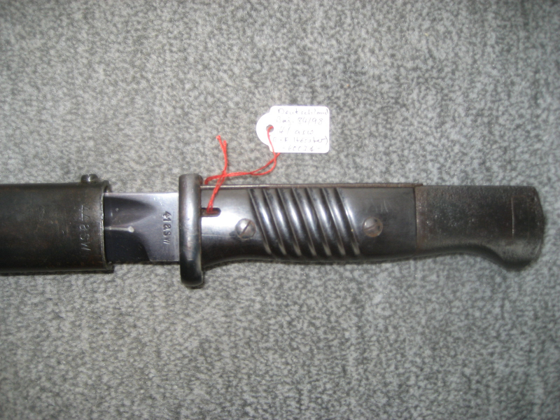 biete aus dem Nachlass einer alten Sammlung ein Bajonett 84/98 der Fertigung "41asw" (E.+F.Hörster) Insges. im guten Zustand bis auf beidseitige Rostnarben im Bereich des Knaufes (Bild 4) dafür Sehr schöne Klinge mit noch fast 90% Bräunierung, nicht angeschliffen oder sonstwie beschädigt. Scheide ebenfall sehr schön nur kleine, leichte Dellen im unteren Bereich. Gest. mit "44asw" und Nr auch im 6tsd.-Bereich also stimmig zum Bajonett, alles "E+F Hörster". Drücker frei.