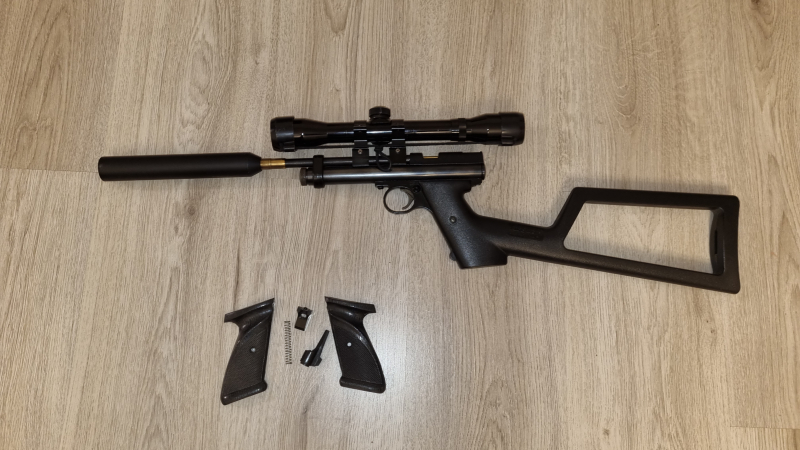 Verkaufe CO2 Pistole Crosman 2240 Sniper Kaliber 5,5 mm + Hinterschaft Schalldämpfer Adapter Zielfernrohr 4x32