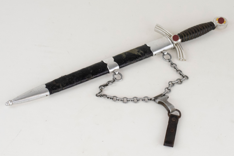 Scheide mit Aluminiumbeschlägen. Vergoldete H.Kreuze auf Knauf und Parierstange. Inklusive Tragekette aus Aluminium und Koppelschlaufe aus Leder. Gewicht inklusive Tragekette mit Koppelschlaufe: 396g