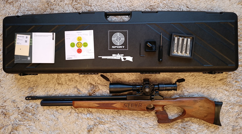 Auf der "Challenge Hunting" befindet sich ein Hawke Airmax 30 WA SF (6-24 fache Vergrößerung/2.Bildebene und ebenso auf 10 m einjustiert b.z.w. die Türme "genullt" ! Weiterhin gehören dazu ein Steyer -Kompensator/Füllstück/Adapter/Kartusche und der zugehörige Waffenkoffer ! Die Kartusche hat eine "Haltbarkeit "/nächstes Prüfdatum 2033!