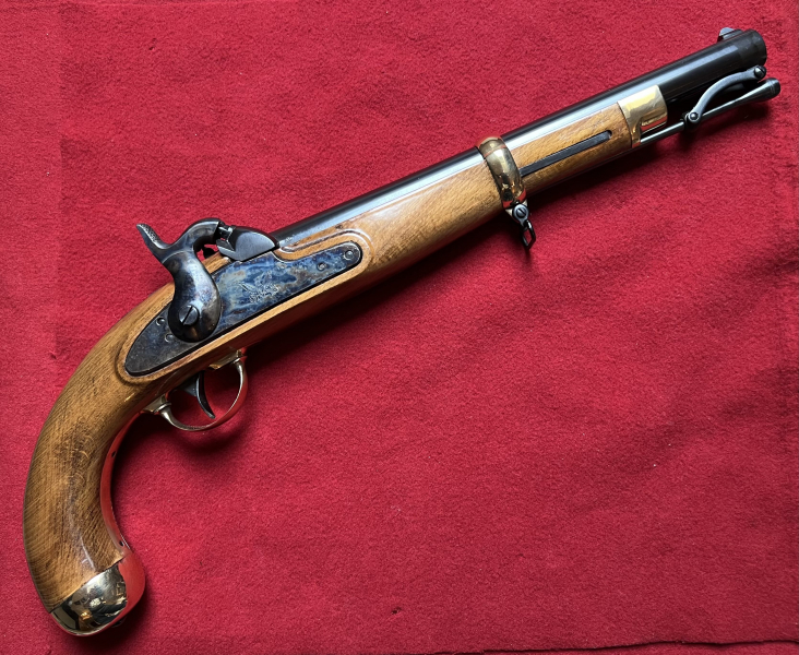 Achtung Pedersoli-Fans: Im Angebot eine von Antonio Zoli in Gardone gefertigte US Calvary Pistole, mit angelenktem Ladestock und Klappvisier. Cal.45.