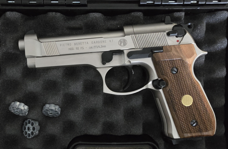 Hallo, biete hier eine Beretta 92FS CO2 in 4,5mm Diabolo, Nickel. Die waffe ist in einem hervorragenden Zustand, minimale gebrauchspuren, sie hat echtholzgriffschalen. Sie Funktioniert einwandfrei. Mit dabei: 3 laderinge und waffenkoffer.