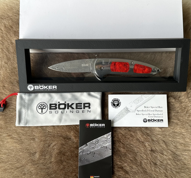 Böker Damast Speedlock 1 2.0 Damast mit Coral.Damast Chad Nichols/USA im Muster „Scramble“. Als Einlage kommt auf Hochglanz polierte, echte Koralle zum Einsatz, die von den Spezialisten von Santa Fe Stoneworks in aufwändiger Handarbeit in die Griffe eingelegt wird. Streng limitiert auf 199 Exemplare