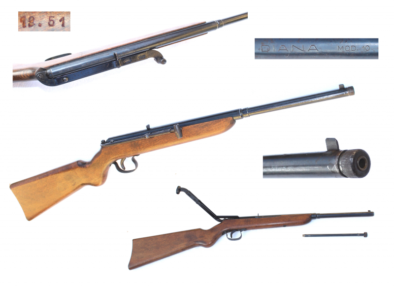 Angeboten wird ein gut erhaltenes und voll funktionstüchtiges Seitenspanner-Luftgewehr DIANA Mod.10. Das Laden eines Diabolos oder eines Federbolzens erfolgt über den heraudrehbaren Lauf. Die Leistung dieses kleinen Gewehres ist noch recht gut. Der Schaft weist keine Risse oder sonstige Beschädigungen auf. Die Originalbrünierung ist leicht fleckig - aber kein Rost. Am Schaftende ist die Herstellungszeit eingeprägt (12,61). Nach dem Zweiten Weltkrieg durfte ab 1949 wieder das Diana-Logo benutzt werden und es wurde wieder erlaubt, leistungsschwache Luftgewehre ohne Züge zu produzieren. Somit war das Modell 10 der erste Seitenspanner von Diana, der von 1949 bis 1953 gefertigt wurde. Nur wenige dieser Gewehre haben die Zeit "überlebt".
