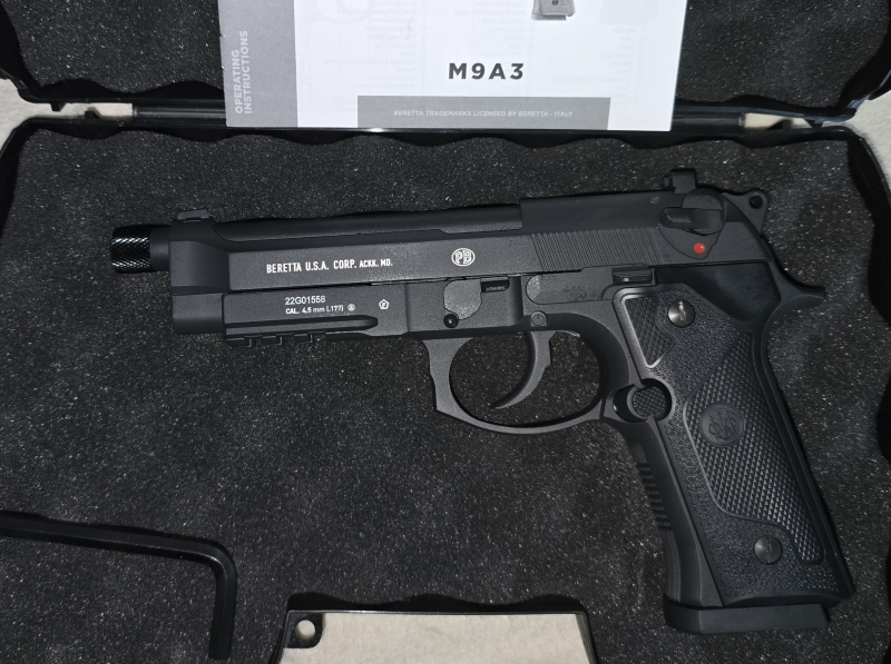 Hallo, biete hier eine Beretta M9A3 CO2 in 4,5mm BB, schwarz. Die waffe ist in einem neuwertigen Zustand, keine gebrauchspuren. Sie Funktioniert einwandfrei, wurde nicht geschossen. Mit dabei: Werkzeug, anleitung und waffenkoffer.