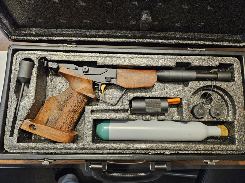 Mit als Zubehör gehört der passende abschließbare Koffer, eine Gebrauchsanleitung mit Komplettaufbau der einzelnen Teile der Pistole und Inhalt (siehe Foto). Die Gaskartusche zum Nachfüllen der Pistole ist ausgelegt für 250 bar und von 1995.