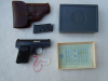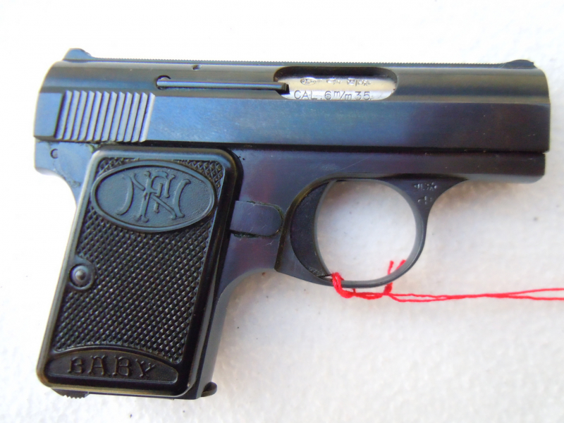 FN Selbstladepistole Mod. "Baby" im Kal. 6,35 Browning. Neuwertiger Zustand mit original Box, Bedienungsanleitung, Reservemagazin und einer kleinen Tasche aus sehr weichem Nappaleder. Gültiger belgischer Beschuß. Export nur über einen deutschen Händler.