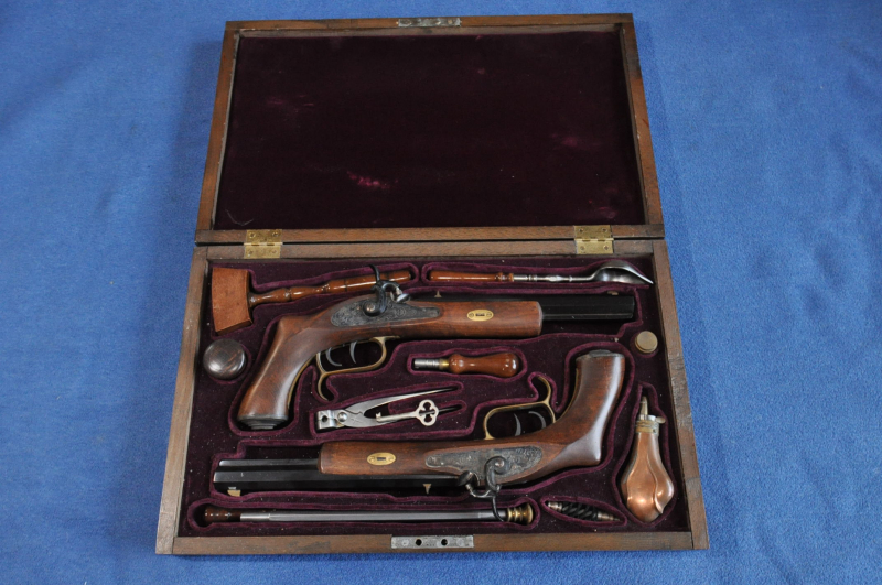 Superschöner, kompletter Duellkasten inkl. Schlüssel. Waffen ist in einem sehr schönen Zustand, siehe Bilder, volle mechanische Funktion. Hergestellt in Spanien. Läufe sehr gut. Augenscheinlich ungeschossen, aus Sammlung.