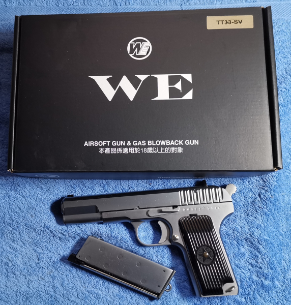 TT-33 Pistole (Tokarev) Es handelt sich um eine wunderschöne, gebrauchte Vitrinenwaffe in Silber aus meiner Sammlung mit der nie geschossen wurde. Lediglich Pflegekapseln fanden Anwendung um die Dichtungen geschmeidig zu halten wie ich es mit all meinen Co2-Waffen mache. Der Maßstabsgetreue Vollmetall Nachbau der sowjetischen TT-33 Pistole, wie sie in den 1930er Jahren bei der Roten Armee als Ordonnanzwaffe eingeführt wurde. Die Wei-ETech Nachfertigung kommt mit halbautomatischen Gas-Blow-Back System (co2)und besitzt eine komplette Metallrahmenkonstruktion wodurch auch das passende Gewicht von ca. 685 g zustande kommt. Bis auf sehr wenig Kleinteile und die Griffschalen ist die komplette Pistole aus Metall hergestellt. Auf dem Schlitten und Rahmen befinden sich eine eingravierte Seriennummer sowie die Jahreszahl 1941. Interessant ist hierbei, dass die Seriennummer wie beim Original leicht schräg eingraviert ist. Ein weiteres sehr schönes Detail sind die beidseitig im Griffstück eingearbeiteten CCCP-Stern Logos. Wie beim Original ist auch die Funktionsweise der Wei-ETech TT-33 Pistole. Zuerst ein geladenes Magazin einsetzen, dann den Schlitten nach hinten ziehen. Jetzt ist die Pistole bereit zum Schießen. Wird der Abzug betätigt wird, dank Gas-Blow-Back Schusssystem, der Metallschlitten wie bei einer echten Pistole pro Schuss nach hinten und wieder nach vorne bewegt. Hierdurch tritt ein originalgetreues Schussgefühl auf, da auch ein metallischer Sound beim Schießen ertönt. Ist das Magazin leer geschossen, bleibt der Schlitten wie bei der echten Pistole hinten stehen. Nach dem Einlegen eines neuen bzw. geladenen Magazins muss dann auch hier der Schlittenfang gedrückt werden. Ein weiteres interessantes Feature ist die Abzugsicherung. Wird die Pistole transportiert oder im Holster getragen befindet sich auf der linken Seite ein kleiner Hebel über der Griffschale. Ist der Hebel nach unten gedrückt ist der Abzug blockiert. Wird der Hebel nach oben gedrückt kann die Pistole eingesetzt werden. Diese Funktion ist vor allem wichtig für Spieler, dank sehr kleiner Abmessungen des Hebels fällt dieser aber auch für Sammler nicht ins Gewicht zumal er auch problemlos entfernt werden kann. Das sehr gut verarbeitete GBB (Gas Blow Back) Modell besitzt eine hohe Schusseffizienz und ein einstellbares Hop-Up System. Die Schussleistung beträgt um die 0,8 Joule. In das herausnehmbare Magazin können bis zu 15 6mm BB Rundkugeln geladen werden. Die seitliche Öse dient zur Befestigung eines Pistol-Lanyards.  Lieferumfang:     OVP     Wei-ETech TT-33 Vollmetall GBB 6mm BB Silber     Magazin für 15 Schuss Silber     Technische Details:     Farbe: schwarz     Kaliber: 6 mm BB (0,20g empfohlen)     System: GBB - Gas-Blow-Back / halbautomatisch     Material: Aluminium / Stahl / Verbundkunststoff     Magazinkapazität: 15 Schuss     Länge: ca. 194 mm     Gewicht: ca. 685 g     Maßstab: 1/1     Leistung: bis zu 0,8 Joule     Hersteller: Wei-ETech / Socom Gear s. auch meine anderen Auktionen! Bieter mit Sonnenbrille oder Bewertung "0" bitte vor Gebotsabgabe bei mir melden. Ich teile dann meine E-Mail Adresse mit unter der mir ein amtl. Altersnachweis (z. B. Kopie PA) zugeschickt werden kann. Bei Nichtbeachtung wird das Gebot gelöscht u. der Bieter gesperrt! Gilt nicht für ID-Mitglieder! Der Versand erfolgt mit DHL als versichertes Paket mit Sendungsverfolgung. Es handelt sich um einen Privatverkauf, also keine Garantie, Rückgabe, Minderung oder bei Verlust auf dem Versandweg! Bitte beachten Sie auch die Angaben unter „ Mein eGun“