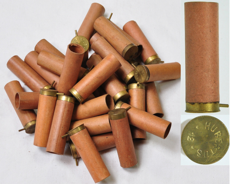 Sie bieten auf ca. 30 leere Lefaucheux-Schrotpatronen-Hülsen der Marke Hubertus, hergestellt von Sellier & Bellot Schönebeck.
