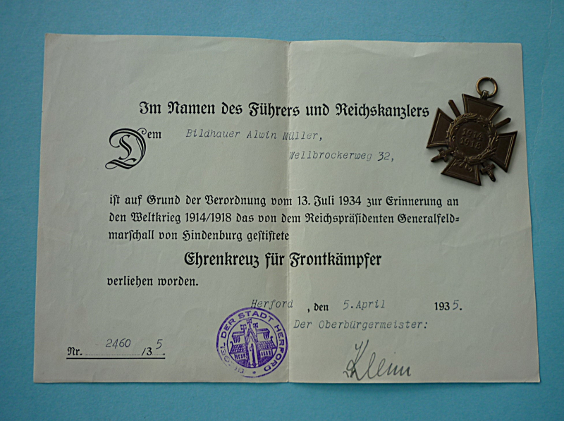 Alter Orden Ehrenkreuz des 1.Weltkrieges KVK + Urkunde .