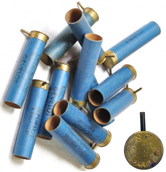 Sie bieten auf ca. 12 leere Lefaucheux-Schrotpatronen-Hülsen, hergestellt von Gevelot / SFM.