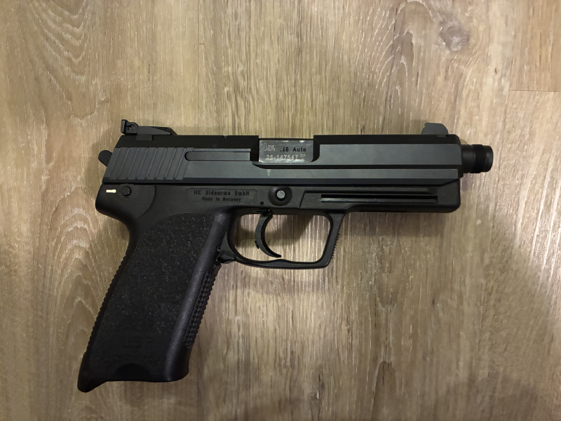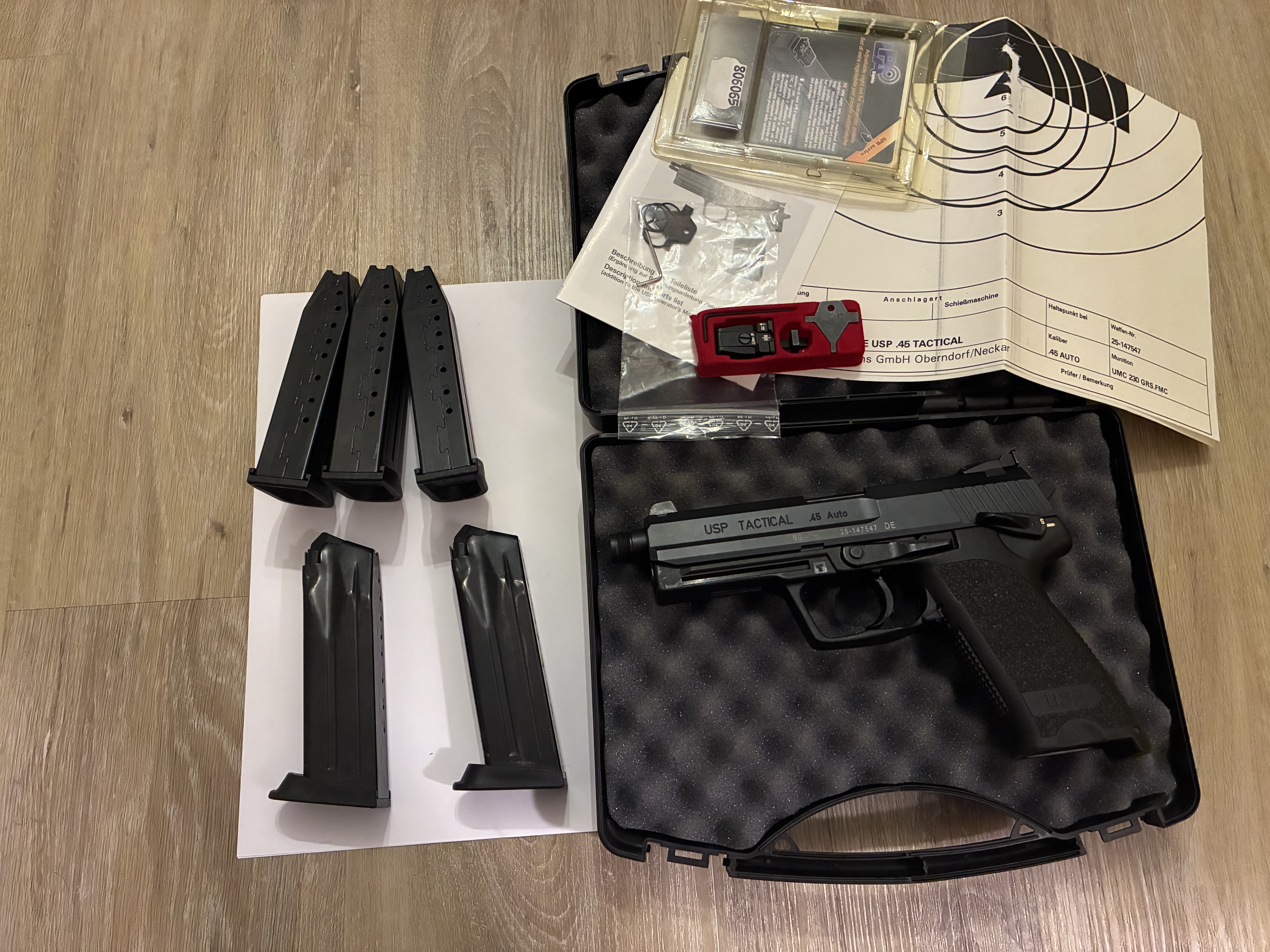 Zum Verkauf steht eine Heckler&Koch USP 45 Tactical im Kaliber .45Auto, inklusive 5x12 Schuss Magazine, ein 2. Satz LPA Visier mit weißem Punkt, Koffer und Schussbild.