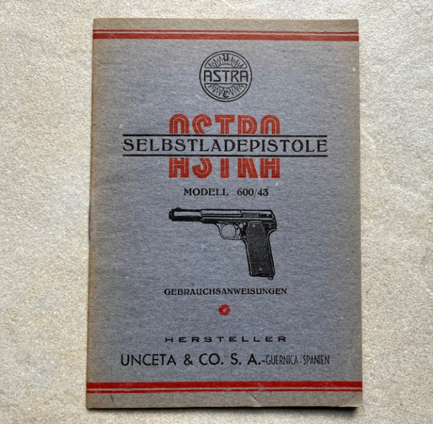 Die Bedienungsanleitung stammt aus meiner Sammlung. Sie enthält kein Druckdatum, aber sie verweist auf eine 35-jährige Tradition im Waffenbau der Firma Unceta & Co. S.A., die die Astra herstellt. Die Firma wurde 1908 gegründet, daher ist die Bedienungsanleitung vermutlich aus dem Jahr 1943. Ich meine sie sieht fast aus wie neu.