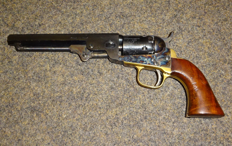 Klein & handlich: Schmuckstück zum Sammeln und lieb haben. WIKE (made in Italy) Perkussionsrevolver in Kal. .31(SP), Lauflänge 15 cm (6 Zoll), guter gebrauchter Zustand. Seitenplatten bunt gehärtet. Funktion einwandfrei.