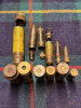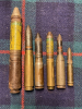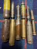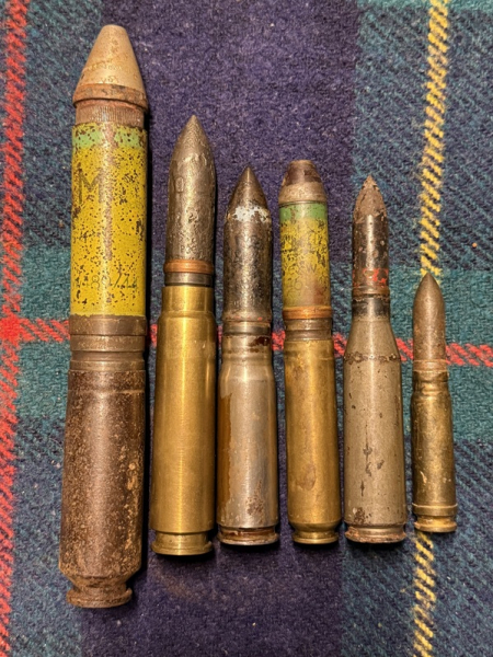 Zum Verkauf kommt ein Konvolut von 6 Deko Patronen von der Luftwaffe der Wehrmacht. Von links nach rechts: Eine Patrone 3cm Mk108 mit Minengranate, eine seltene 2cm Patrone MG 204 (parallele Entwicklung von Rheinmetall zum MG FF, wurde jedoch nur in wenige Flugzeuge verbaut und spielte im Krieg keine große Rolle) mit Üb Panzergranate, eine Patrone 2cm MG 151/20 mit Panzergranate PH und Bodenschraube, eine Patrone 2cm MG FF mit Minengranate, eine Patrone MG 151/15 mit Panzergranate und ein Patrone 1,31 cm MG 131 mit Panzergranate. Eine gute Gelegenheit ein schönes Luftwaffenkonvolut der Wehrmacht zu erwerben.