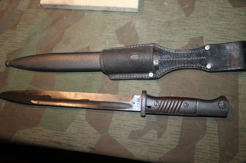 Angeboten wird ein Nummergleiches Bajonett der Firma Eikhorn (cof) von 1944, Klinge ist nicht beschliffen, Drücker funktioniert einwandfrei, das Bajo hat die seltenene rot-orangen Griffschalen