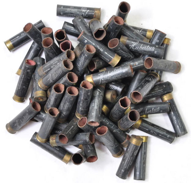Sie bieten auf insgesamt ca. 140 Stück leere abgeschossene Schrotpatronen-Hülsen der Marke Hubertus in zwei Varianten, mit und ohne Kaliber-Ring, hergestellt vom VEB Sprengstoffwerke 1 in Schönebeck.