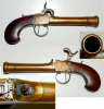 Schöne original Perkussionspistole mit Messingkasten und Messinglauf. Der Lauf öffnet vorne etwas tromblonförmig auf 21 mm, das Kaliber dürfte 12-13mm betragen, die Waffe wurde von Steinschloss auf Perkussion aptiert, was man an der Batteriesicherung und der Stelle des ehemaligen Batteriegelenks erkennt, sehr starke Feder und technisch in Ordnung, Lauflänge 11,4cm, Gesamtlänge 23,7 cm