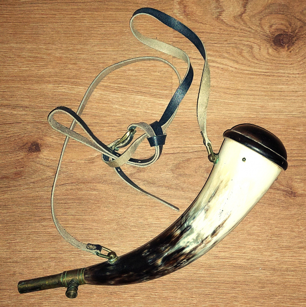Zum Verkauf kommt hier: Eine gebrauchte Pulverflasche, Pulverhorn mit Lederriemen, auch als schöne Wand Deko zu verwenden: