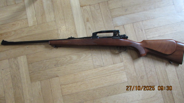 Dt. Backe, Abzug mit dt. Stecher, Flügelsicherung gültiger Beschuss ist vorhanden, Schweinsrücken, Kimme gebrochn und Korn, Riemenbügelösen, festes Magazin für 4 Patronen, Eramatic Schmwwenkmontage mit Klemmschiene für Zf mit Außenschiene.