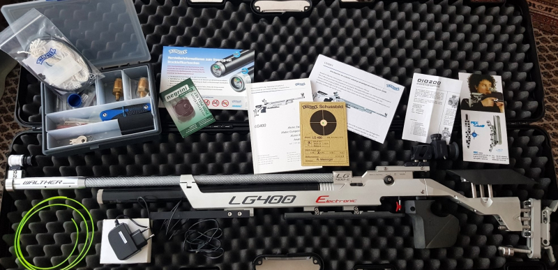 Geliefert wird das LG400-E im originalen Walther-Koffer (verschließbar), mit Ladegerät, Zubehör, Bedienungsanleitung und Schußbildkarte.