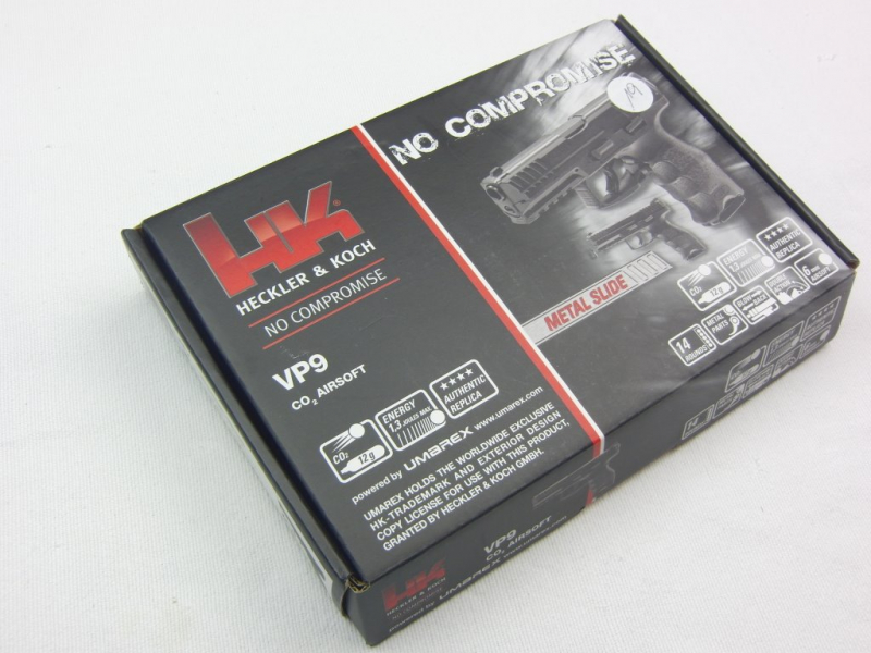 Aus Sammlungsauflösung: Sie bieten auf eine CO2 Airsoftpistole Heckler&Koch VP9 im Kaliber 6mm Airsoft. Max. Energie 1,6Joule, Metall Schlitten und Lauf, Blow Back, Double Action, 14-Schuß Magazin. Im Originalkarton mit Bedienungsanleitung. Die Pistole wurde nicht geschossen. NEUWERTIG!!!
