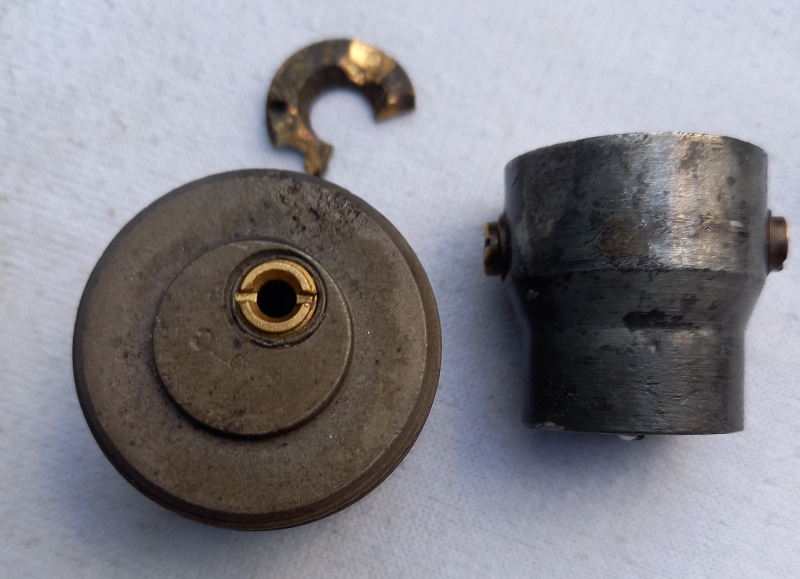 Die hier angebotenen Teile stammen aus einem solchen Zünder. Der Zünderkörper war im Gegensatz zu dem Vorgenannten aus Zink und völlig unbrauchbar. Die hier angebotenen Teile sind extrem selten und müssten in den Eisenkörper passen. Der Messingdeckel zum Zündpillenträger ist nachgefertigt, das originale Reststück anbei. Der Zink wurde an einigen Stellen nachgearbeitet. Alle Teile sind frei von jeglichen verbotenen Stoffen.