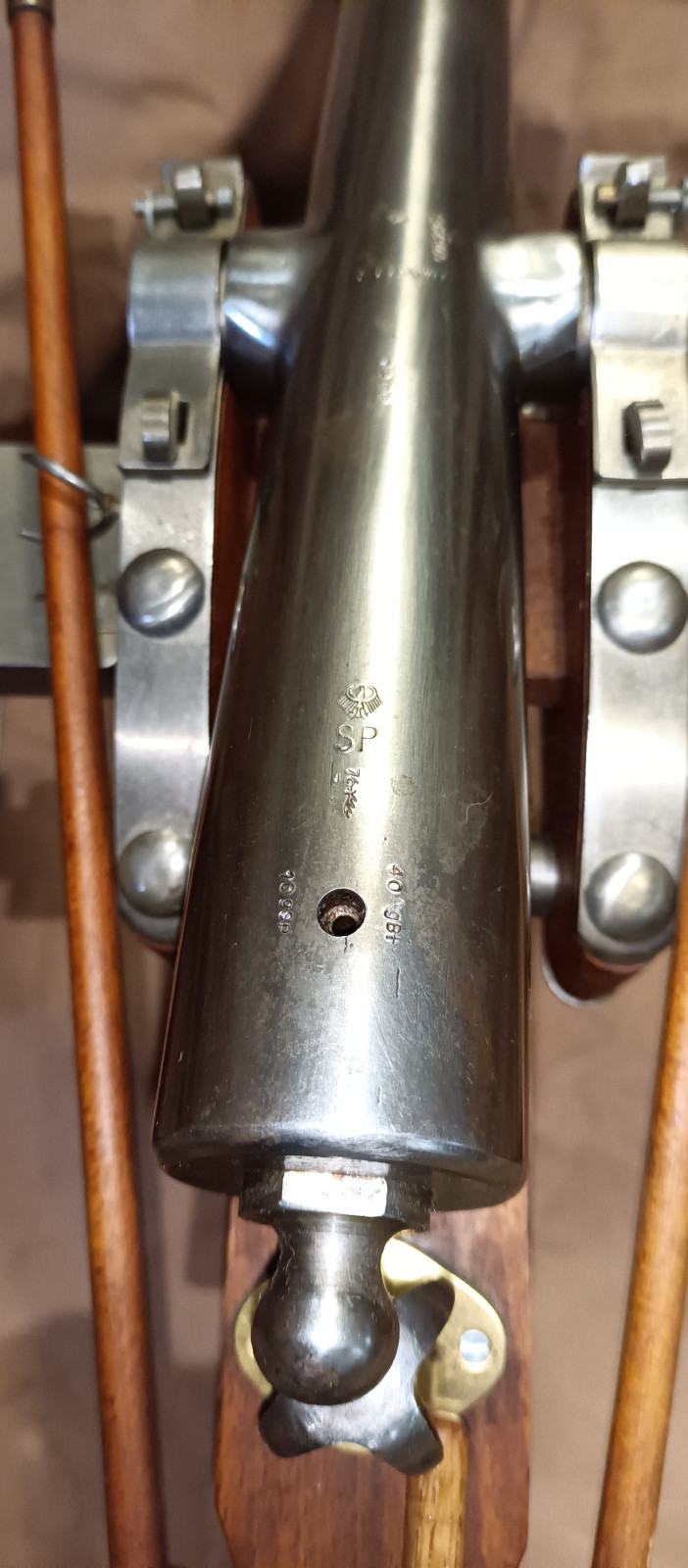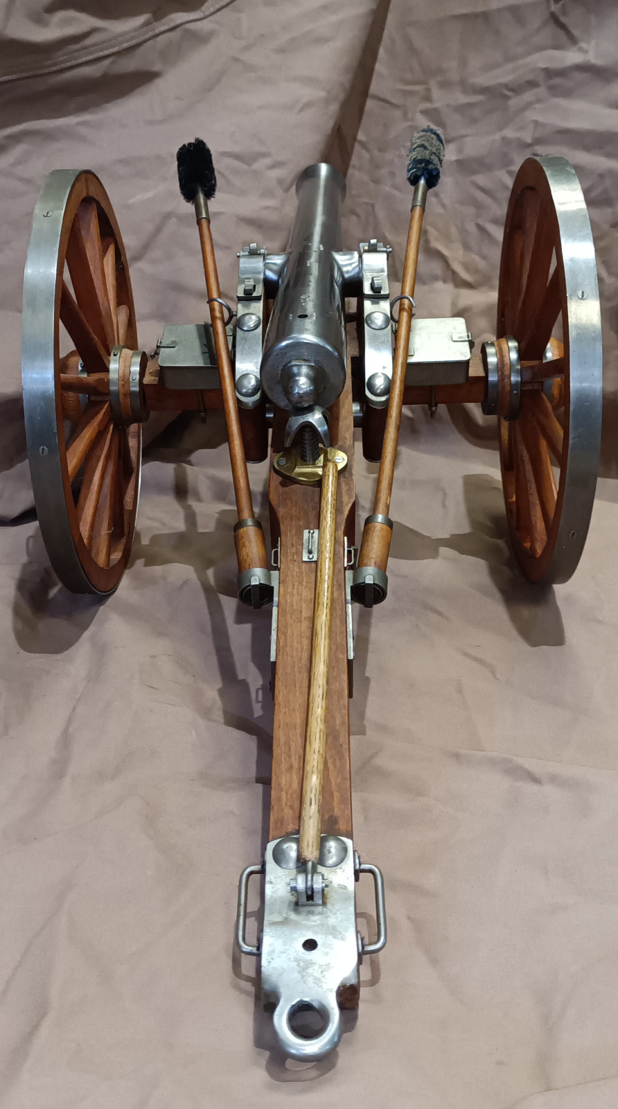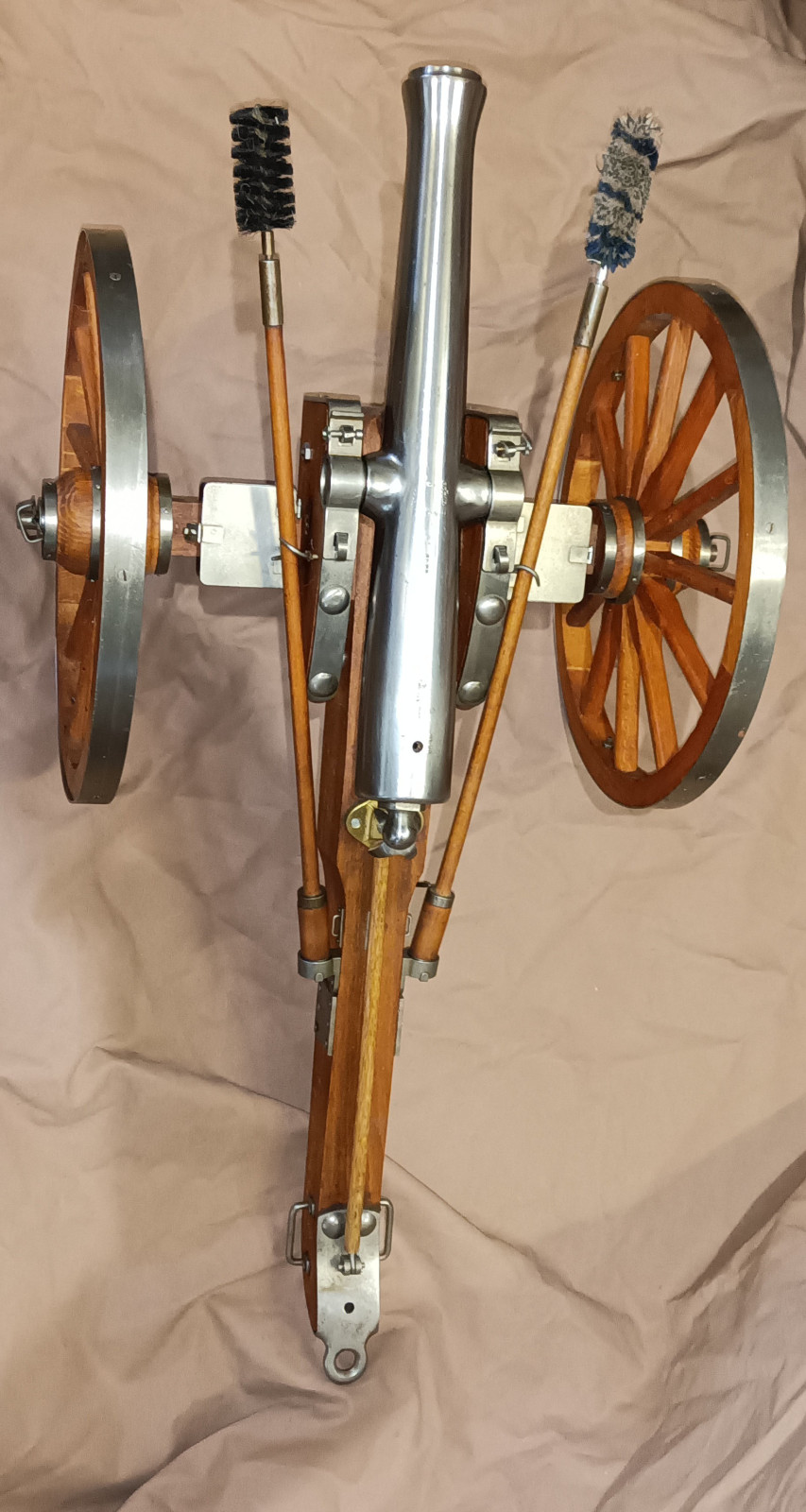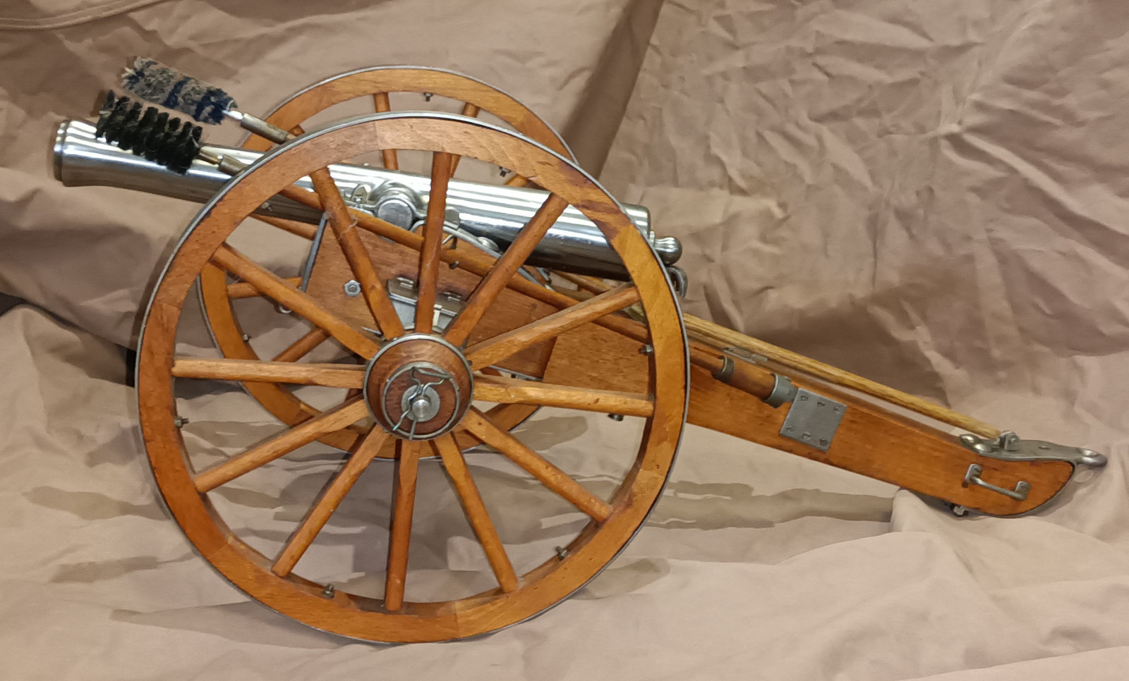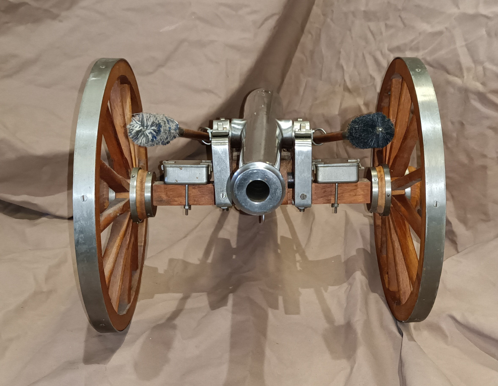 Frankreich/USA, M 1853/1857, "Napoleon", 12-Pfünder. Eisenrohr, Beschuss SP 1976, (L 38 cm), Kal. 17 mm, mit konisch erweitertem Mündungsbereich und Stossboden mit Traube. Unter derselben eine Stellschraube aus Messing zum Einstellen des Schusswinkels. Nussbaumlafette mit Eisenblechkistchen, Messing- und Eisenbeschlägen; L 70 cm, B 38 cm, H 29 cm Zwölfspeichige Räder mit Eisenreifen d=30 cm.