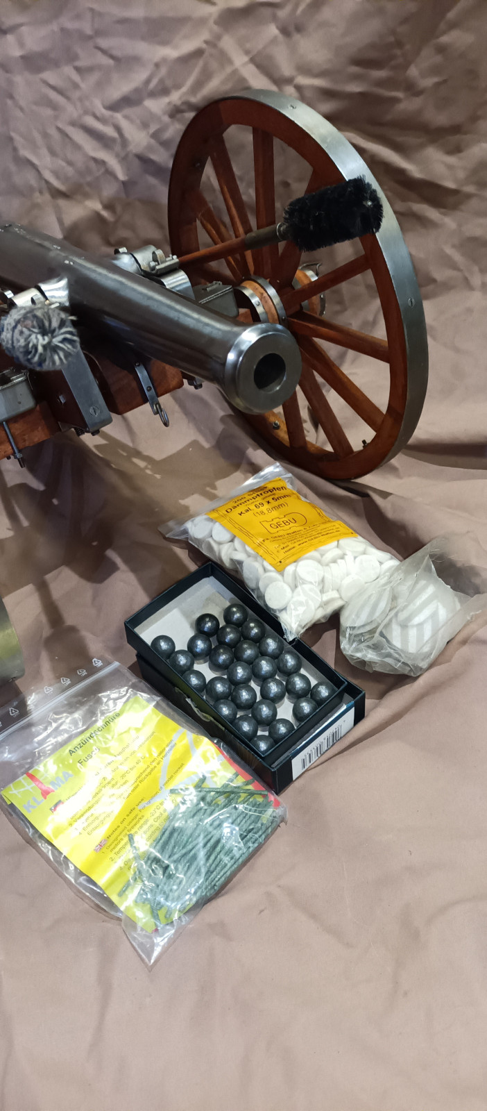 Kugeln Pflaster Filze und Anzündschnüre werden mitgeliefert. Räder und Geschützrohr werden zum Versand Demontiert und sind einfach wieder zu Montieren.