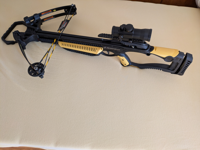 Verkaufe eine neuwertige Armbrust Barnett Recruit Youth 30. Die Armbrust wurde noch nicht benutzt. Zur Armbrust gehört ein Leuchtpunktvisier, drei Pfeile mit Feldspitze, zwei Ersatzfedern und eine Spannschnur. Das Leuchtpunktvisier kann von rot auf grün sowie von Leuchtpunkt auf Fadenkreuz umgestellt werden. Die Bedienungsanleitung ist auf einem beiliegenden Stick gespeichert. Sie in Englischer Sprache, kann aber mit einem Handy einfach übersetzt werden.