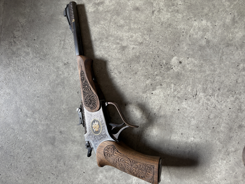 Wunderschön reich gravierte Thompson Contender im Kaliber .38 SP. Ein wirkliches Kunstwerk. Hat keinen Beschuss, ist zum Schiessen allerdings auch viel zu schade. Eine wirklich Traumhafte Waffe. Züge und Felder scharf. Komplette Funktion gegeben. Sehr guter Zustand. Direktversand an Europäische Händler möglich. Fragen Sie bitte nach den Versandkosten. Wie immer völlig unbearbeitet um Ihnen einen ehrlichen Eindruck des Zustandes zu ermöglichen.. Diese Sammelwaffe kann natürlich gerne, nach vorheriger Absprache in Wolfratshausen besichtigt werden