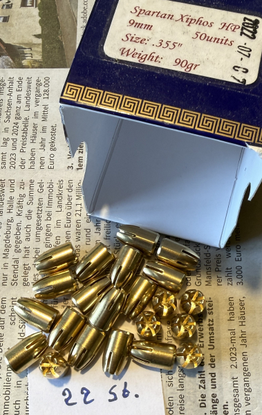 22 Kurzwaffengeschosse 9mm‚  ‘Spartan Xiphos HP‘Wenn Sie mehrere Posten ersteigern sollten, dann melden Sie sich bitte wegen eventuellen veränderten Versandkosten. Da Privatverkauf, keine Garantie und keine Rücknahme.