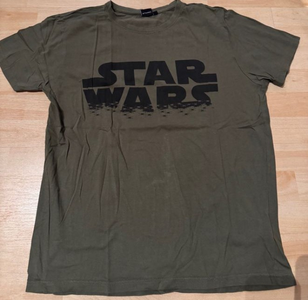 Zum Verkauf steht ein Star Wars Fan-Shirt in Army Green mit markantem Star Wars Schriftzug auf der Vorderseite. Das Shirt ist ein offizielles Lizenzprodukt in Größe L und ungetragen, also in absolut neuwertigem Zustand.
