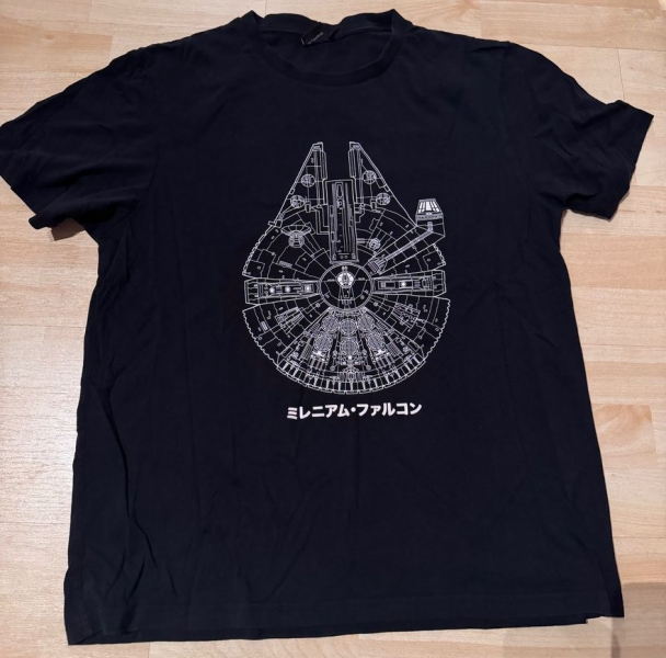 Zum Verkauf steht ein Star Wars Fan-Shirt in schwarz mit großem Millennium Falke Motiv. Das Shirt ist ein offizielles Lizenzprodukt (nicht S. Oliver), in Größe M und ungetragen – also absolut neuwertig.