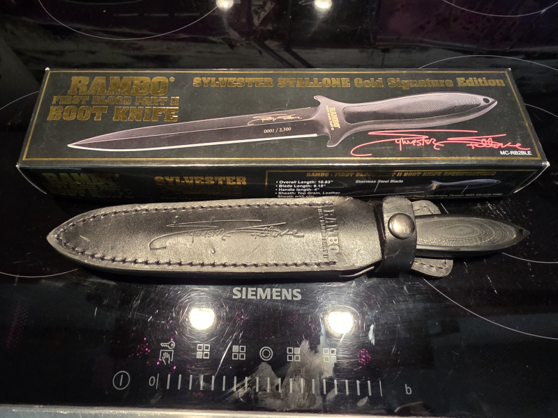 Zum Verkauf ein Rambo 2 Stiefeldolch signierte Edition. Wird als Neuwertig verkauft, das sie immer in der Vitrine war.