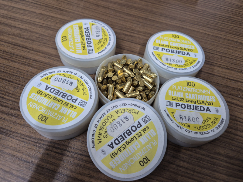 Die Knallpatronen sind meiner Meinung nach mit Schwarzpulver gefüllt und eher stark, verglichen mit dem was es heutzutage so zu kaufen gibt.