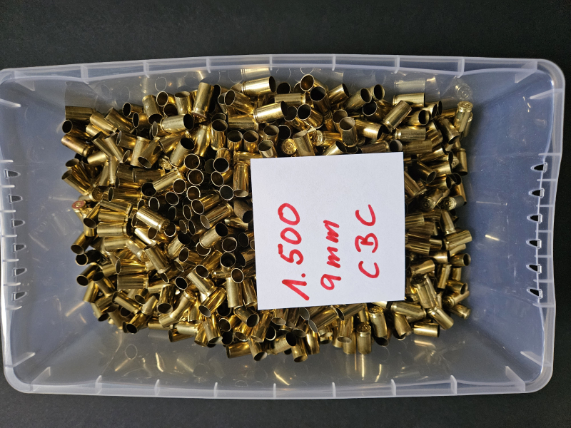 Biete 1.500 Stück CBC Hülsen im Kaliber 9 x 19. Die Hülsen sind gereinigt und können so ohne Weiteres wiedergeladen werden. Max. 5% sind 1 x wiedergeladen